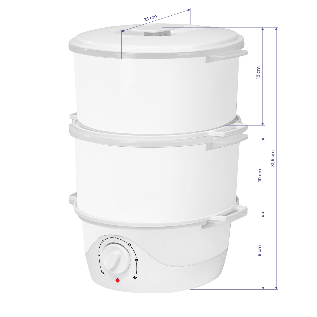 La carcasa del calentador de toallas está hecha de plástico de alta calidad en tonos blanco y negro, lo que no solo facilita su limpieza, sino que también lo hace perfecto para cualquier interior. Pensando en la comodidad del usuario, el calentador de toallas es fácil de limpiar y mantener: los elementos desmontables se limpian o lavan rápidamente, lo que le permite mantenerlo higiénico y listo para usar en cualquier momento. Su diseño compacto facilita su transporte y almacenamiento, incluso en espacios reducidos. Las patas antideslizantes garantizan la estabilidad del dispositivo. Las dimensiones exactas se muestran en la foto. Incluye: depósito de agua, 2 toalleros, elemento separador, tapa, fuente de alimentación e instrucciones. Datos: Temperatura: 100 °C, Temporizador: hasta 30 minutos, Capacidad del depósito de agua: 0,8 L, Potencia: 600 W, Tensión nominal: 120-220 V.
