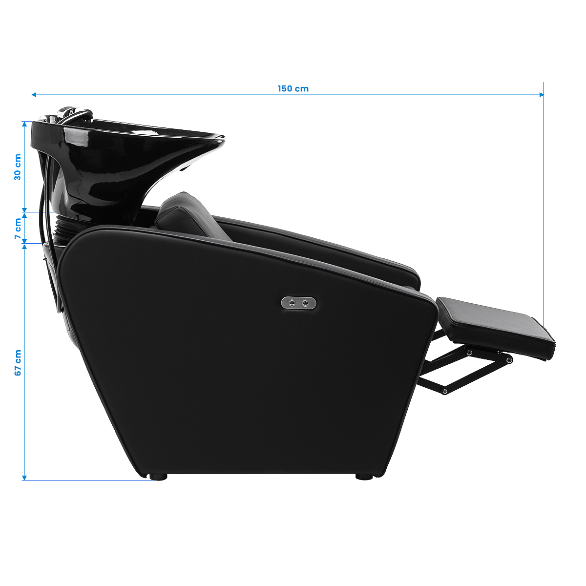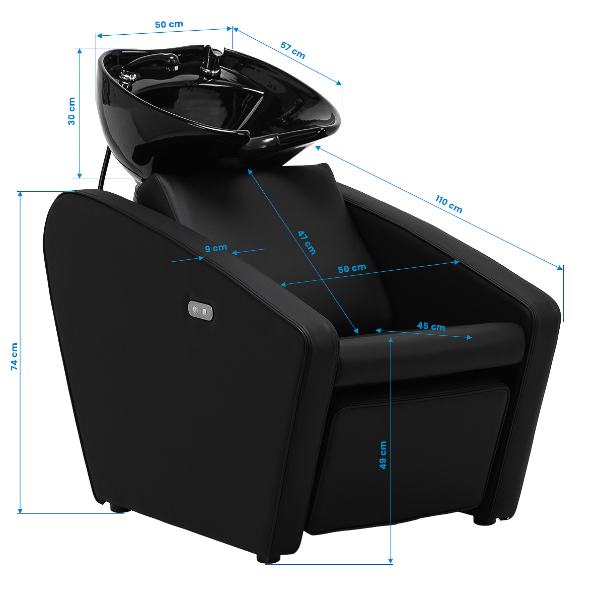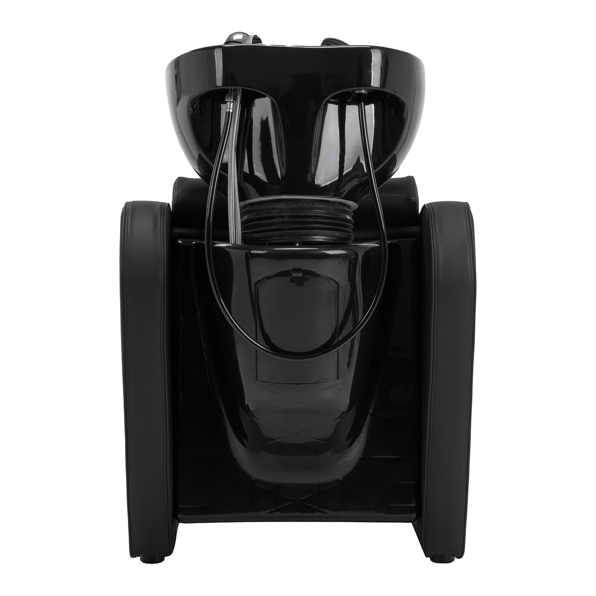 La profundidad del lavabo de cerámica en tonos negros permite realizar una amplia gama de servicios de peluquería de forma cómoda y eficiente, evitando salpicaduras excesivas de agua y productos utilizados durante el tratamiento. El material utilizado hace que el lavabo sea duradero, resistente a la decoloración y a los arañazos, y muy fácil de limpiar. El cuello con un perfil adecuado y el respaldo inclinado proporcionan soporte y comodidad durante el lavado. Gracias a la cómoda capa de plástico en tonos negros, el cliente no sentirá molestias por la fría superficie cerámica.