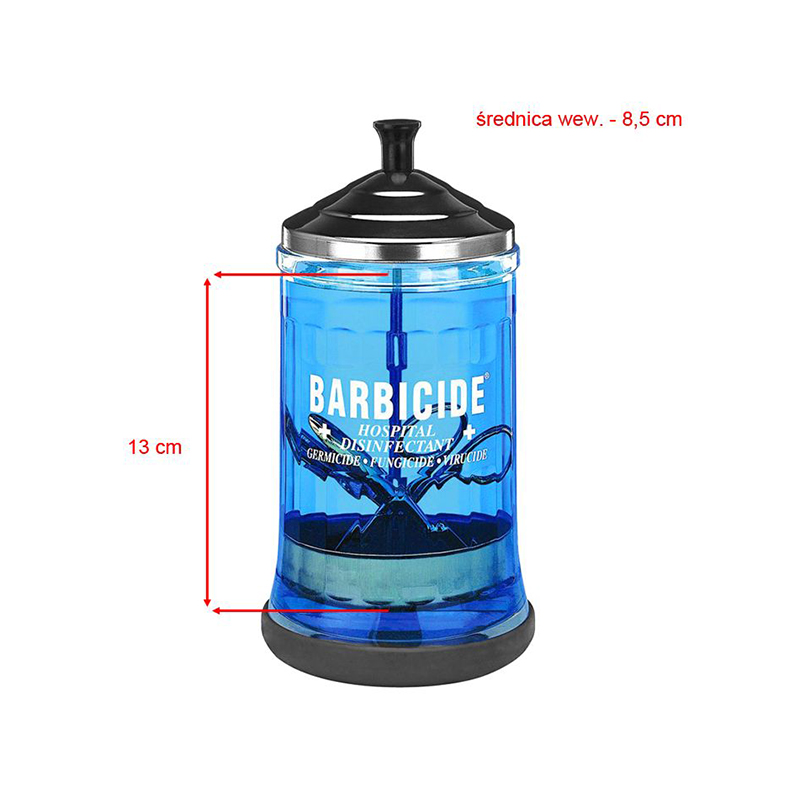 The container is made of high quality glass resistant to chemical biocides. The characteristic Barbicide container with a transparent blue disinfectant is a symbol of a professional and high quality office. The Barbicide container is well known in beauty salons and hairdressers all over the world.