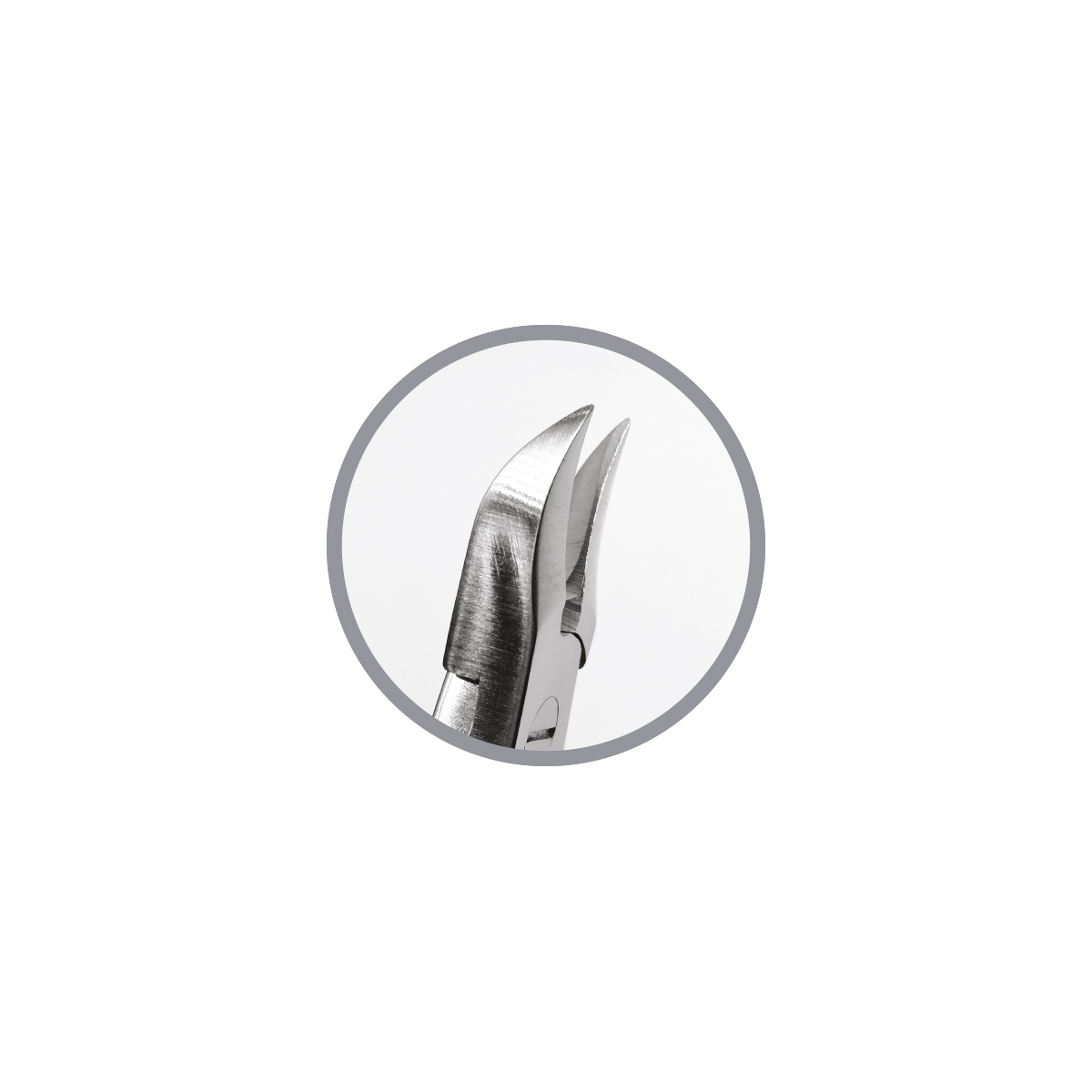 Los alicates con hoja curva (lateral) están fabricados en acero inoxidable de la más alta calidad. Son una herramienta duradera y precisa con una superficie de corte afilada (1,6 cm). El diseño especial de la hoja los hace excelentes para acortar uñas semicirculares. El modelo está equipado con un mecanismo de doble resorte protegido. La herramienta se puede esterilizar en autoclave. Se recomiendan especialmente para su uso en cirugías estéticas y podológicas.