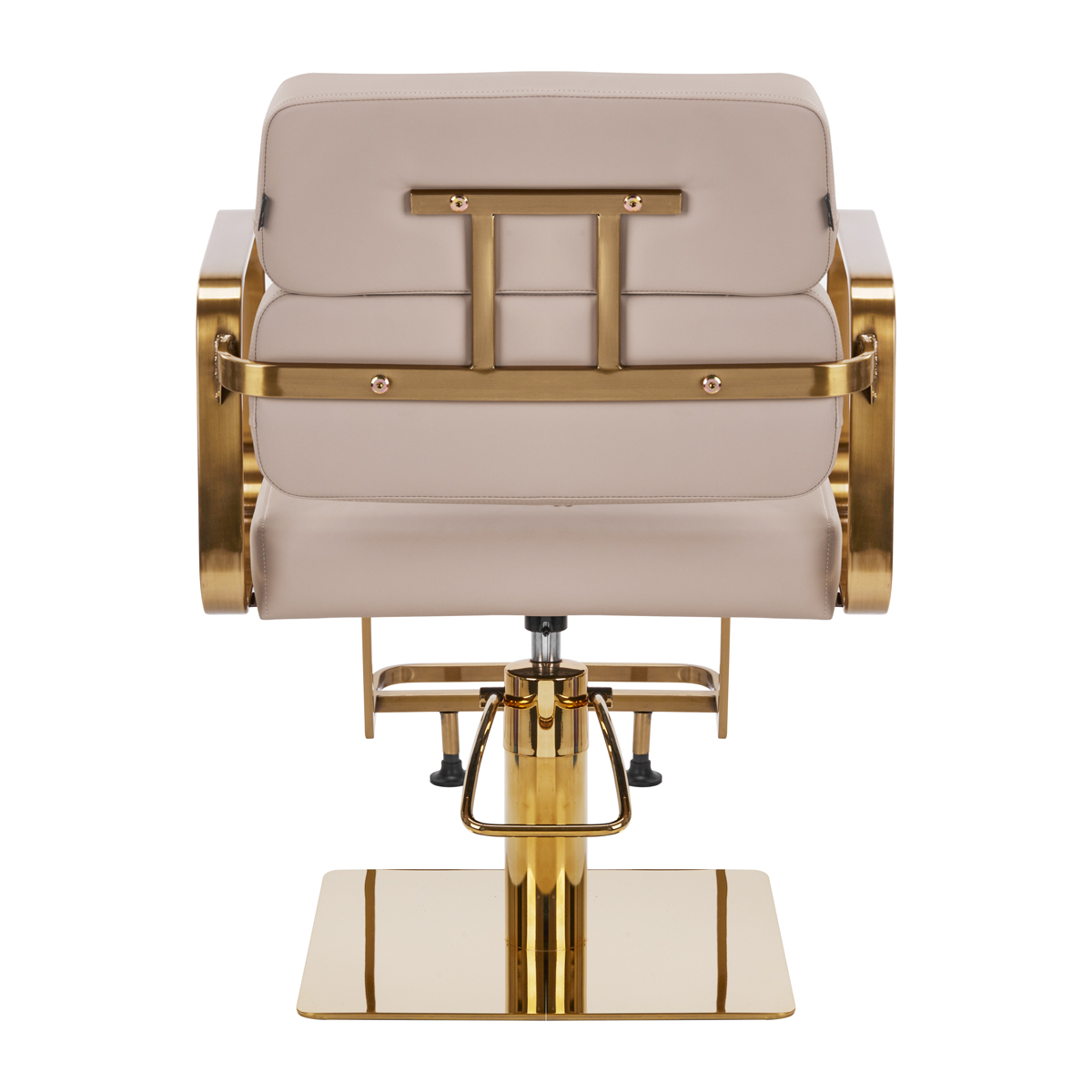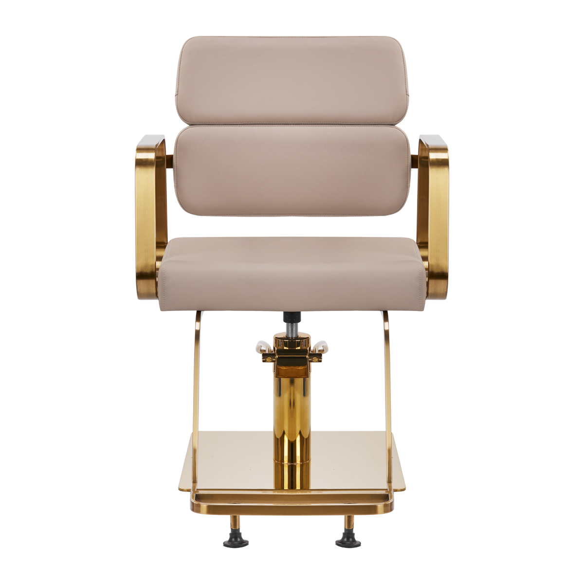 El mecanismo de rotación completa del sillón hace que el trabajo del peluquero sea más efectivo y cómodo. Una base sólida, plana y cuadrada garantiza estabilidad durante su uso. La superficie lisa y mate le da un aspecto elegante y facilita su limpieza. Un cómodo asiento con relleno de espuma garantiza una gran comodidad de uso, incluso durante largas horas de tratamiento. Los reposabrazos geométricos de metal en tonos dorados permiten una correcta posición de los hombros del cliente, evitando que encorve la cabeza y facilite la realización de tratamientos precisos, incluyendo cortes de pelo. Un elegante reposapiés, exclusivo de este modelo, proporciona un soporte estable para los pies.