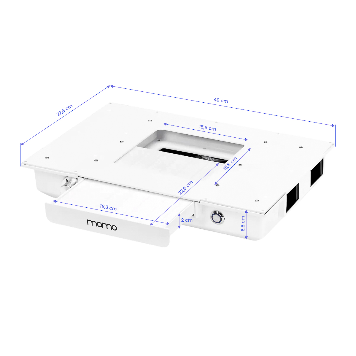 El aspirador de polvo de casete Momo J-02 integrado en la encimera mejora significativamente la comodidad y la higiene en el trabajo, eliminando eficazmente el polvo generado durante tratamientos de belleza, como la manicura. Gracias a este dispositivo, el aire del salón se mantiene limpio y el lugar de trabajo libre de contaminación, lo que aumenta la seguridad tanto del esteticista como de los clientes. El aspirador es fácil de usar y mantener, lo que mejora aún más su funcionalidad. La limpieza y el cambio de filtros regulares garantizan una alta eficiencia de absorción. Es posible adquirir filtros de repuesto adicionales (SKU 123581).