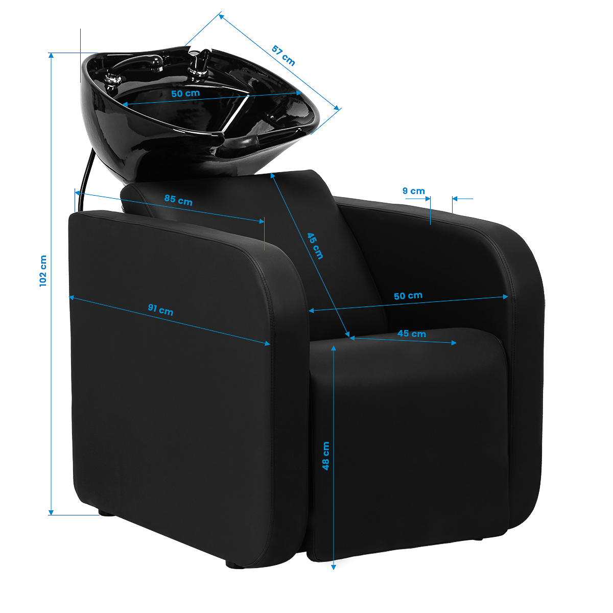 La profundidad del lavabo de cerámica en tonos negros permite realizar una amplia gama de servicios de peluquería de forma cómoda y eficiente, evitando salpicaduras excesivas de agua y productos utilizados durante el tratamiento. El material utilizado hace que el lavabo sea duradero, resistente a la decoloración y a los arañazos, y muy fácil de limpiar. El cuello con un perfil adecuado y el respaldo inclinado proporcionan soporte y comodidad durante el lavado. Gracias a la cómoda capa de plástico en tonos negros, el cliente no sentirá molestias por la fría superficie cerámica.