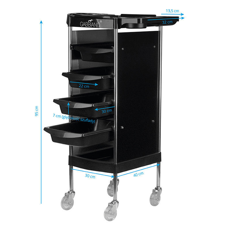 El ayudante de peluquería Gabbiano es un mueble de alta calidad. Está fabricado con material ABS duradero y una estructura de acero que garantiza una alta estabilidad y durabilidad. El conjunto está montado sobre ruedas de goma muy resistentes con cojinetes de bolas. ¡Su clásico color negro combinará perfectamente con la decoración de tu salón!