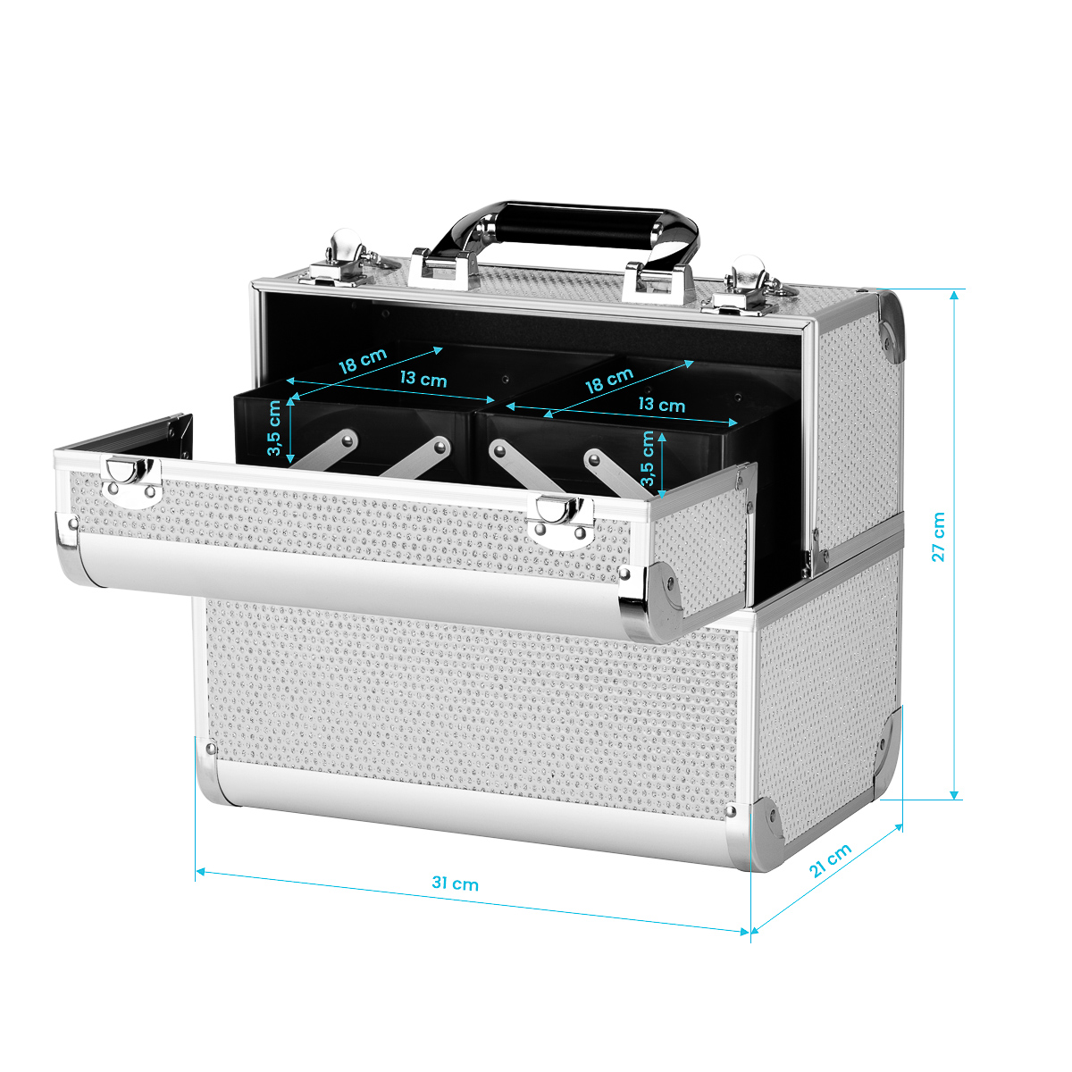 Nuestro showroom se encuentra en Dinxperlo, directamente en la frontera entre los Países Bajos y Alemania. Con nuestra amplia experiencia en el sector podemos servirle de espejo y proporcionarle el asesoramiento adecuado. ¡Hablamos el mismo idioma! Le asesoramos, inspiramos, motivamos y ayudamos en la adquisición de Estuche Para Cosméticos 44 Plata. Nuestros proveedores se encuentran en toda Europa, desde Alemania, Inglaterra, Italia hasta Polonia.