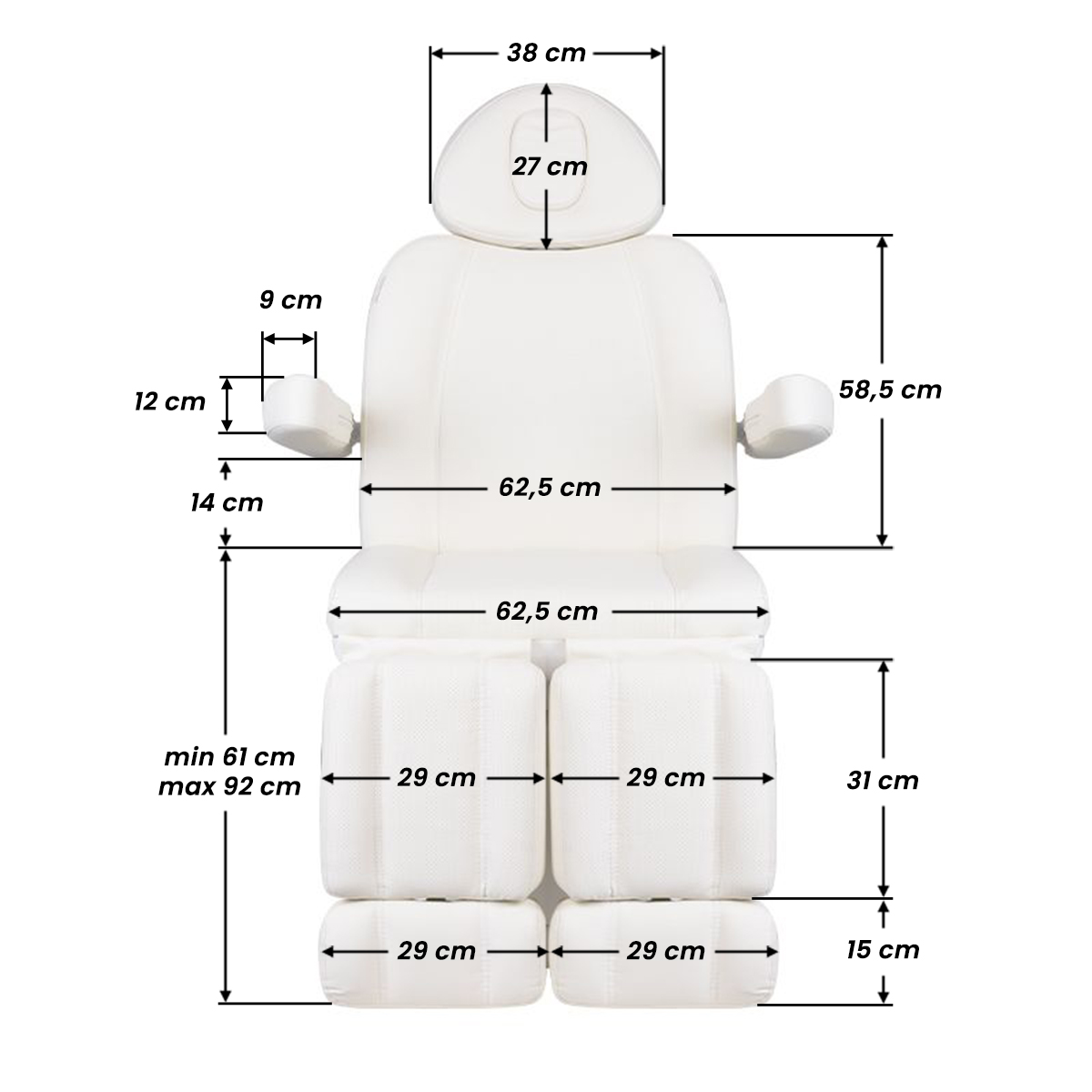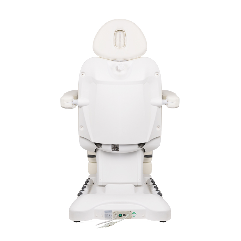 Un sillón eléctrico de estética único, ideal para salones de belleza y spas. Gracias a sus actuadores independientes, permite ajustar el sillón en 3 niveles mediante un control remoto y pedales, ofreciendo la posibilidad de realizar cómodos tratamientos de pedicura, así como tratamientos faciales y corporales. Con el control remoto, se pueden programar los ajustes e iniciar la función de calor. El sillón cuenta con tapizado perforado, una característica inédita en otros sillones, e iluminación LED de colores en la base.